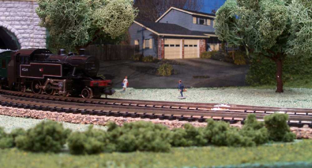At right, a train comes out of the same tunnel, but finished with a portal and decorated.