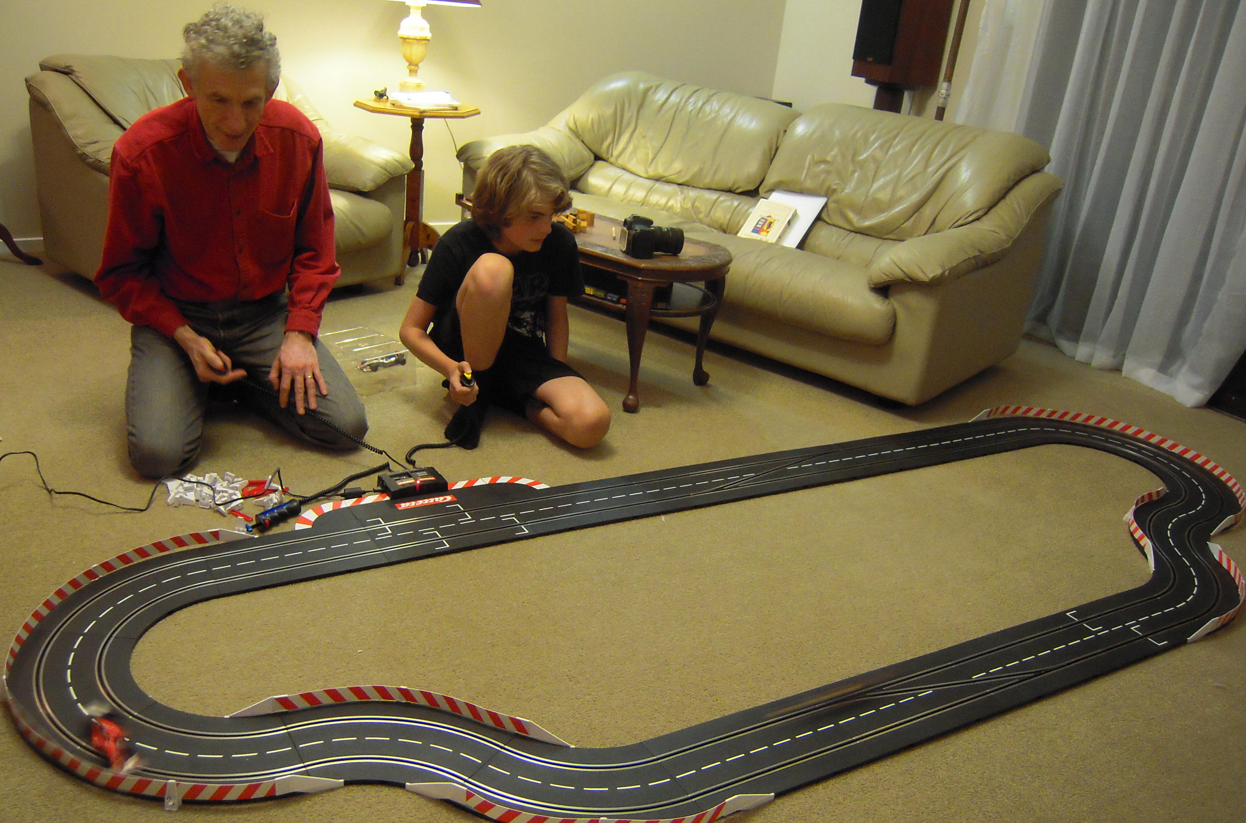 Anyway, when I got back Dad had borrowed the Carrera Digital Slotcar set from work for us to test out. We had a good evening setting it up, and racing around. On this set you can program the cars to do various things, have fuel tanks, be pace cars that dive into the pits (if you have pit stops, that is), or just drive around on cruise control. The cruise control sucker is great for practice. He lane changes at random moments, he can be pretty dangerous! Then he went beserk. We think his little electronic brain fused. It was pretty exciting.