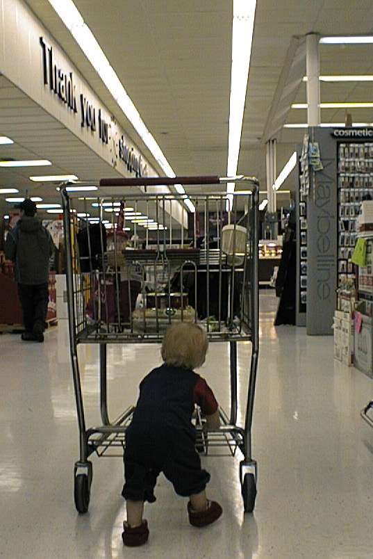 I've got this great scam where I walk along with one of these things exhausted mummies use to get around the stores. They think I can't walk without it you see, so I get real stroppy if they tell me to stop and I get away with it... heh, heh.