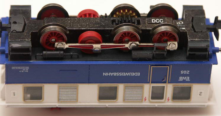 This is an underside view of the Fleischmann Edelweiss Cog Locomotive,