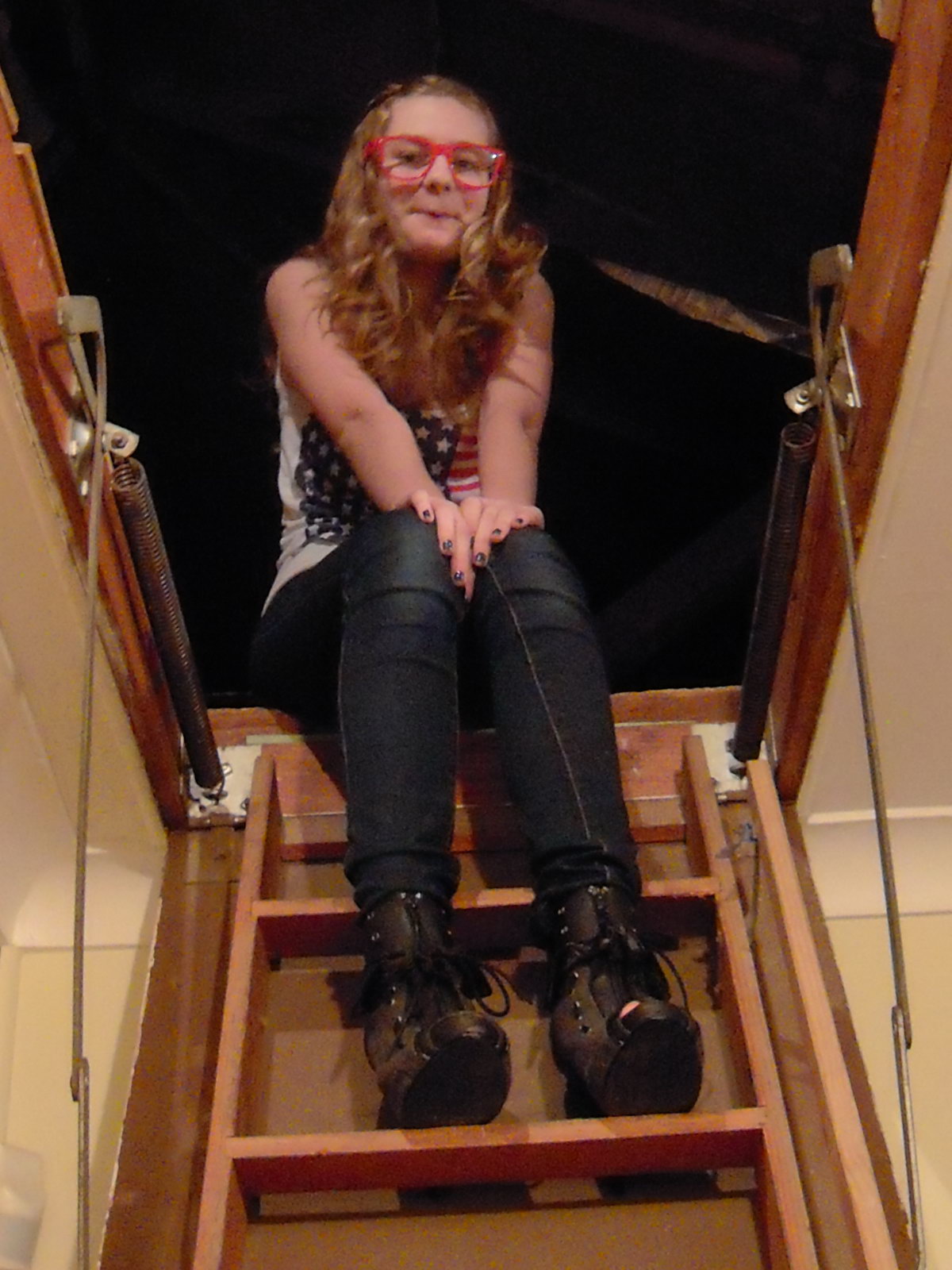 This is me on the ladder up to Poppy's attic. The weather was awful most of the time so we would up doing small stuff.
