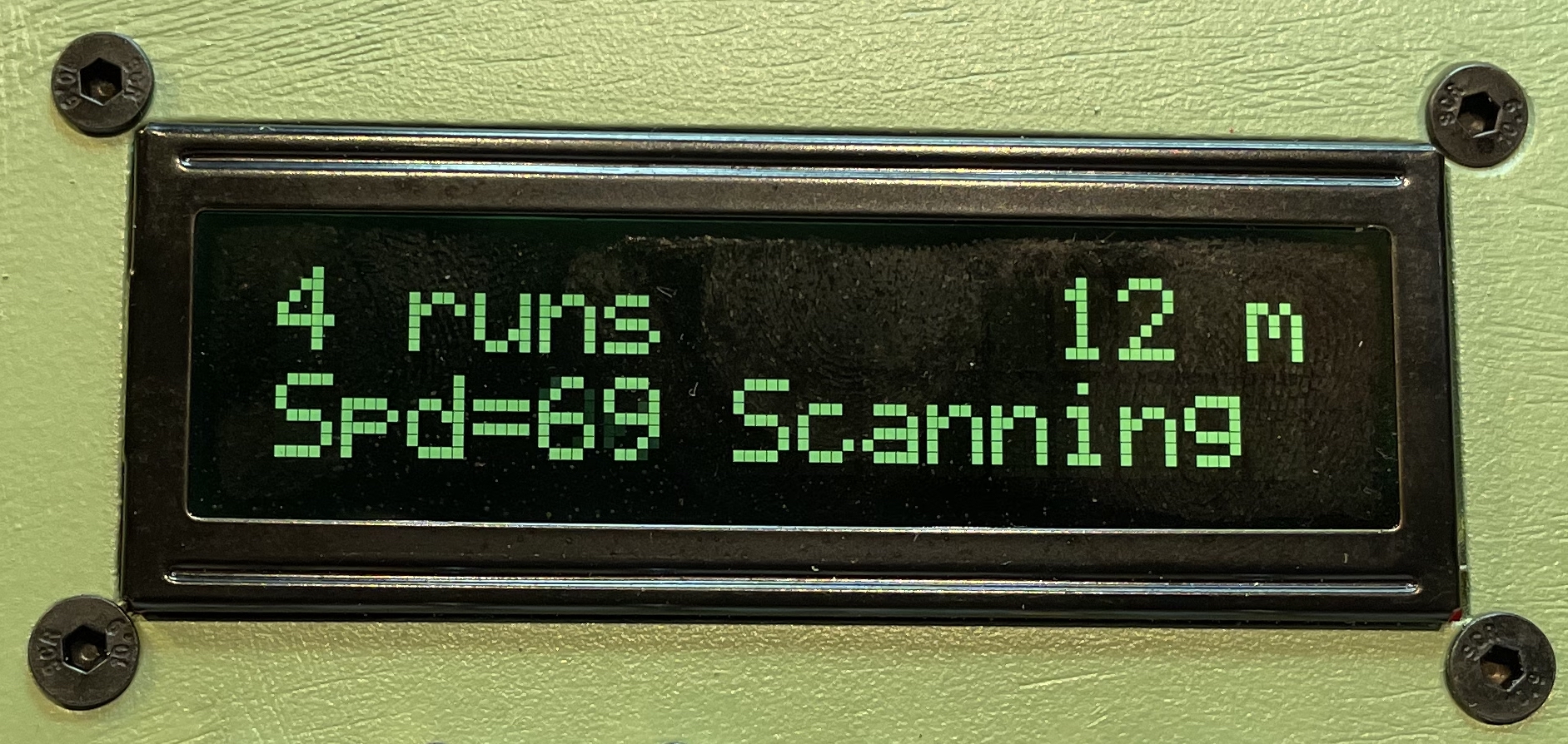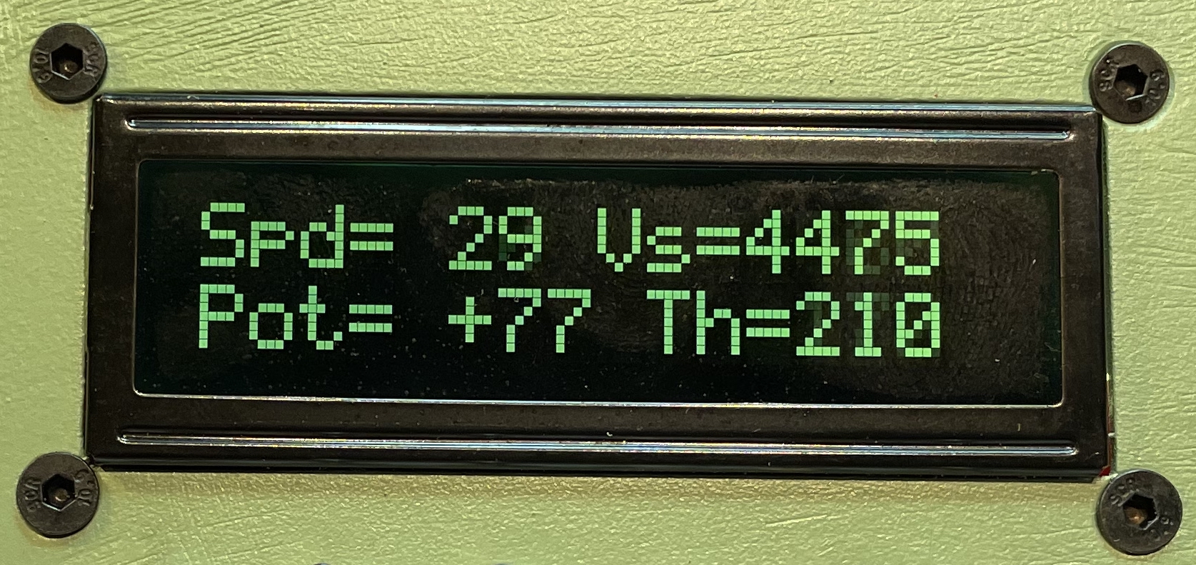 The display here shows the locomotive speed, below that the throttle setting given by the user, the supply voltage, and the "amount of engine push" that is actually being delivered. Remember that this is a feedback controller, so the electronics tries to deliver whatever "acceleration" is required to achieve the requested speed. This is much like the cruise control in your car.